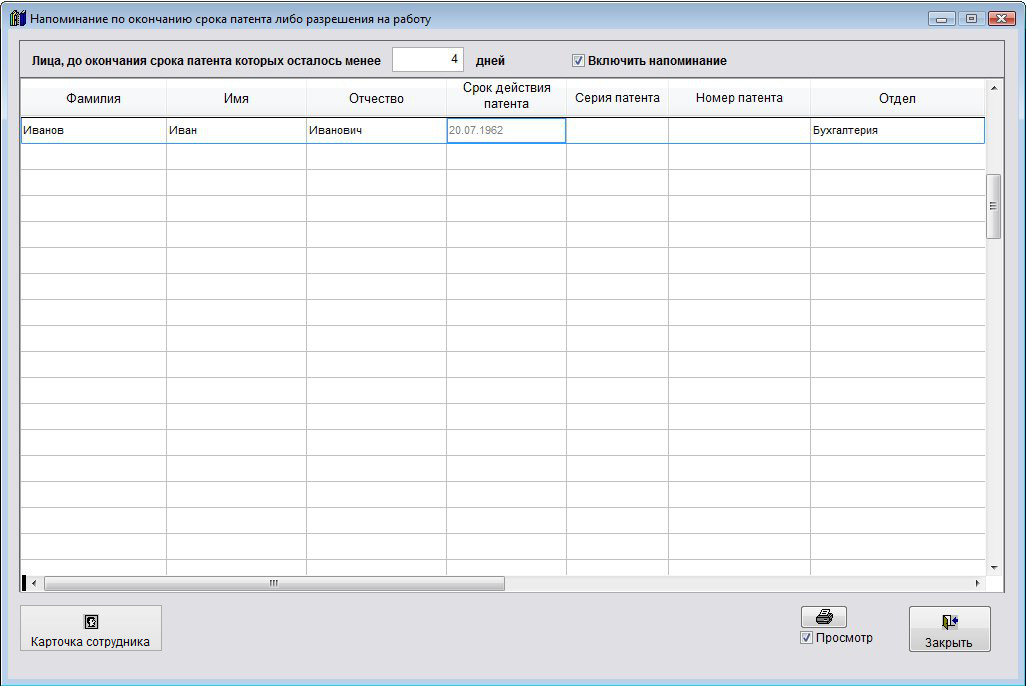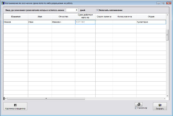 Если в разделе Отчеты-Оповещения-Напоминание по сроку разрешения на работу или патента установлена галочка "Включить напоминание", то при запуске модуля Сотрудники откроется окно оповещения по сроку разрешения на работу или патента.
