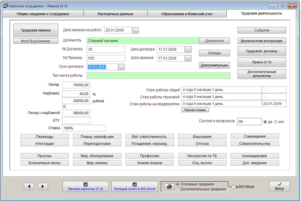 Для того, чтобы сработало оповещения по сроку трудового договора сотрудников, откройте карточку сотрудника (кнопка Изменить), и заполните поле "Срок договора" в закладке "Трудовая деятельность".