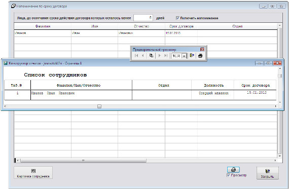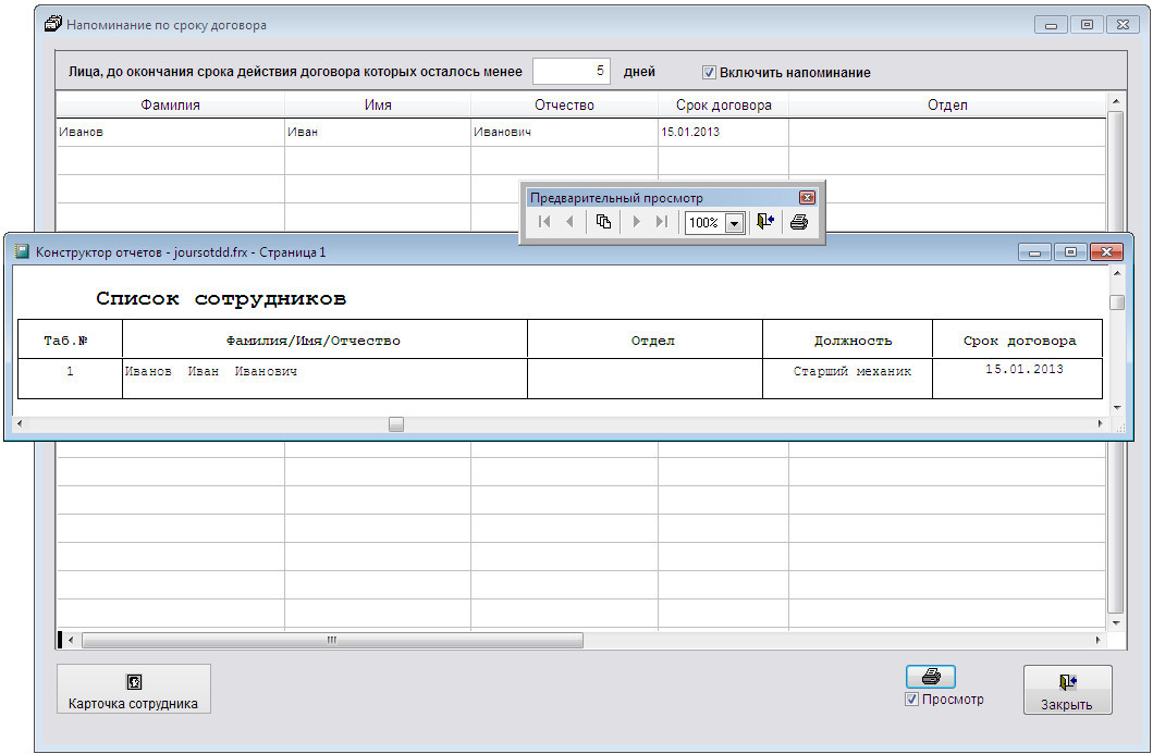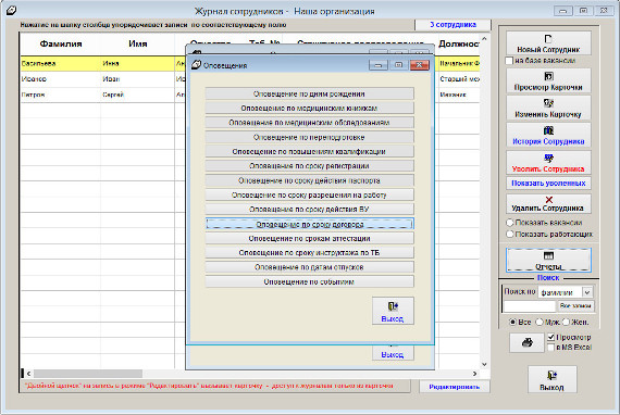 Напоминание появляется при загрузке модуля Сотрудники, также есть возможность просмотра окна напоминания в разделе Отчеты.