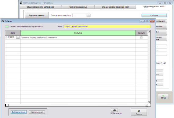 Для того, чтобы сработало оповещение о событиях, откройте раздел События в закладке Трудовая деятельность в правой верхней части карточки сотрудника, и внесите информацию о событиях.
