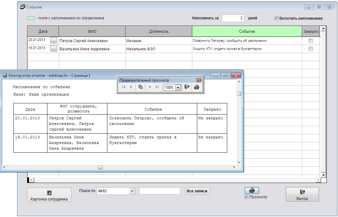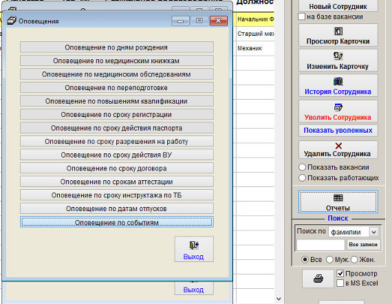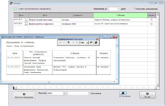 Если в разделе Отчеты-Оповещения-Напоминание о событиях установлена галочка "Включить напоминание", то при запуске модуля Сотрудники откроется окно оповещения о событиях.