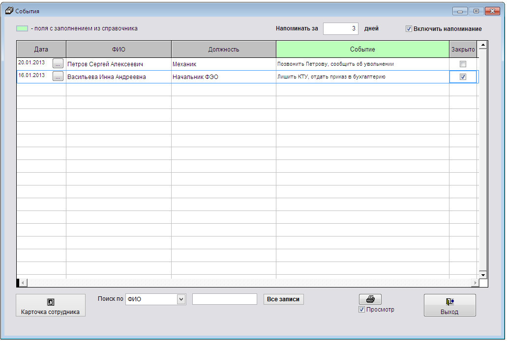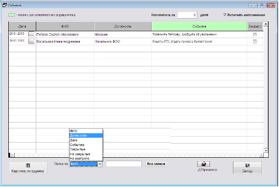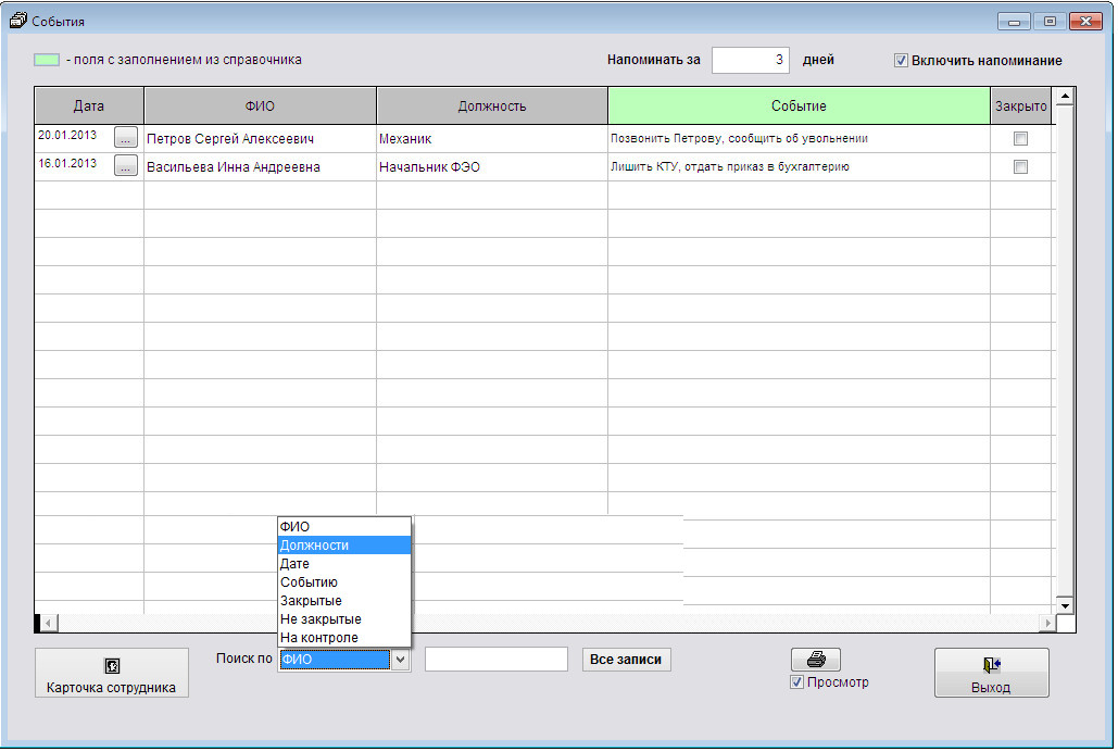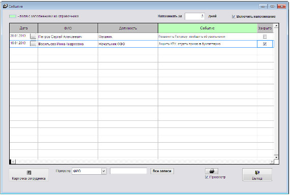 В напоминание попадут те незакрытые события сотрудников, до дат которых осталось менее указанного количества дней.