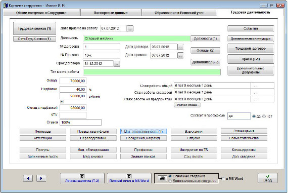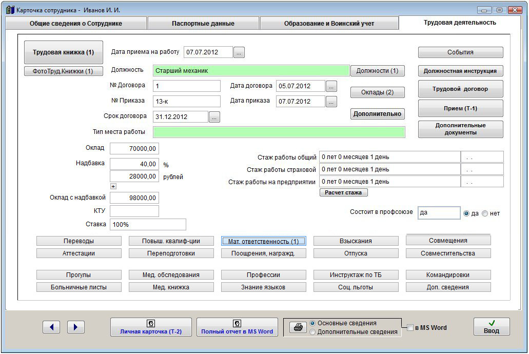 Для печати приказа о материальной ответственности сотрудника откройте карточку сотрудника на редактирование (кнопка Изменить карточку в журнале сотрудников) и нажмите кнопку "Мат. ответственность" в закладке "Трудовая деятельность".