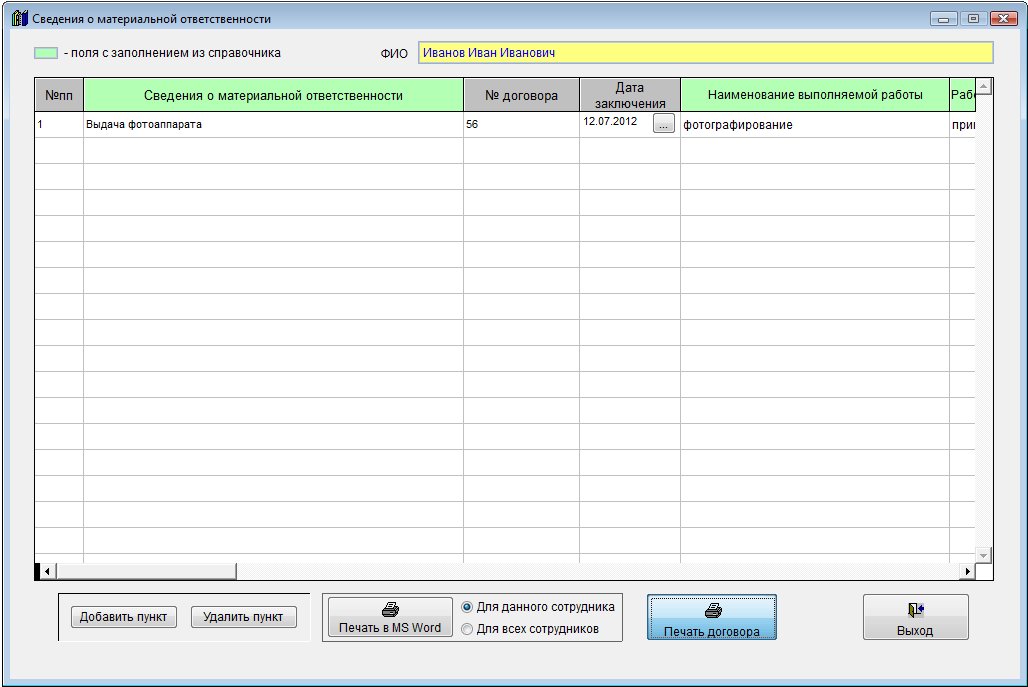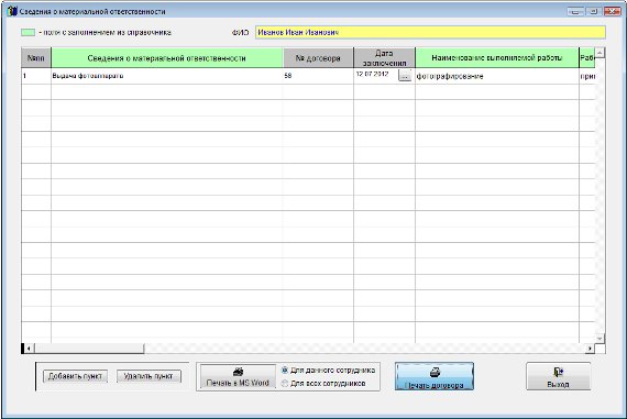 Для печати договора о материальной ответственности сотрудника в разделе "Сведения о материальной ответственности" выберите нужную запись в таблице и нажмите кнопку "Печать договора".