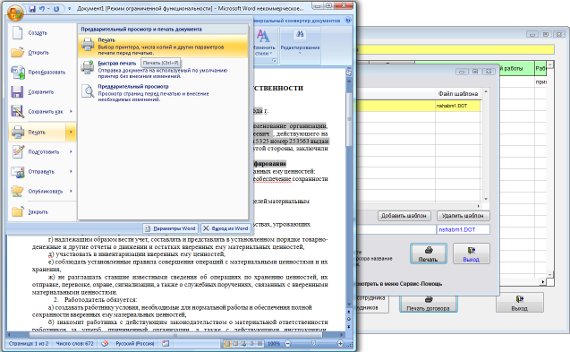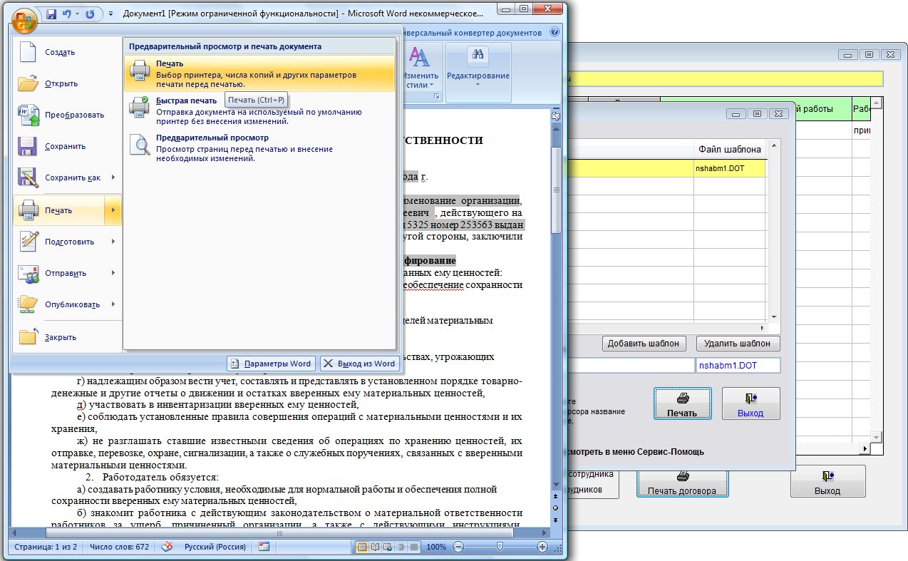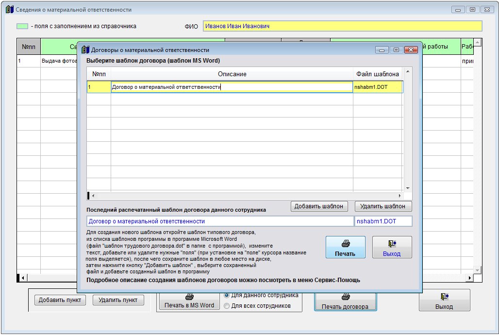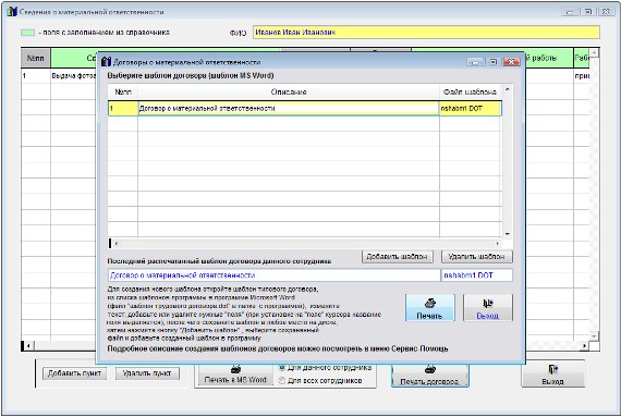 Откроется окно, в котором можно распечатать договор о материальной ответственности на базе шаблона, добавить в программу свои шаблоны приказов.
