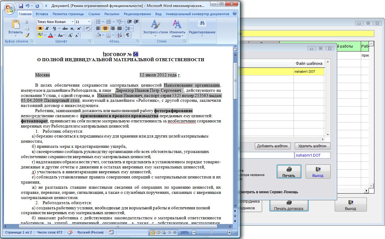 В программе есть возможность формировать договоры о материальной ответственности в установленном Microsoft Word либо при соответствующей настройке в OpenOffice Writer на базе своих шаблонов.