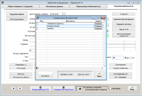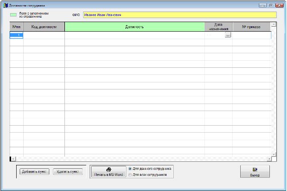Для внесения информации о предыдущих должностях сотрудника нажмите кнопку Должности.