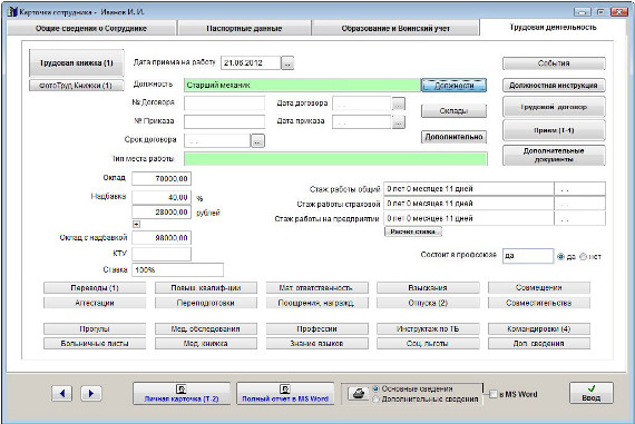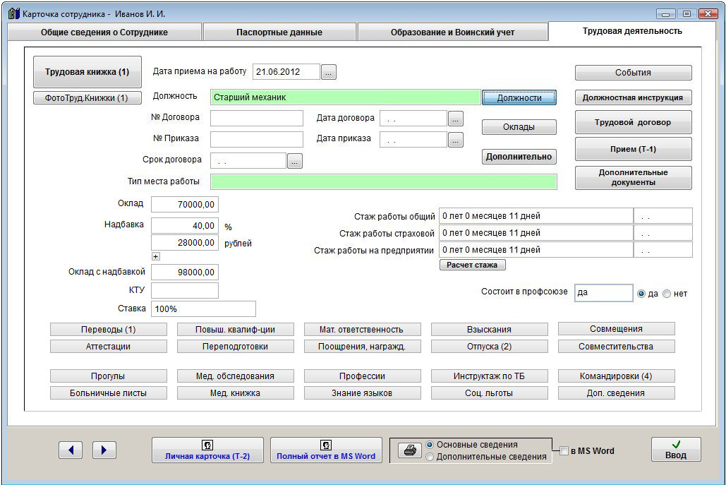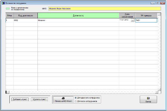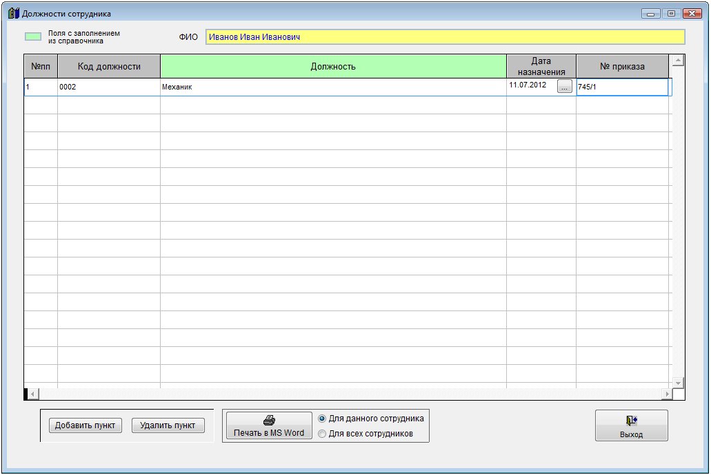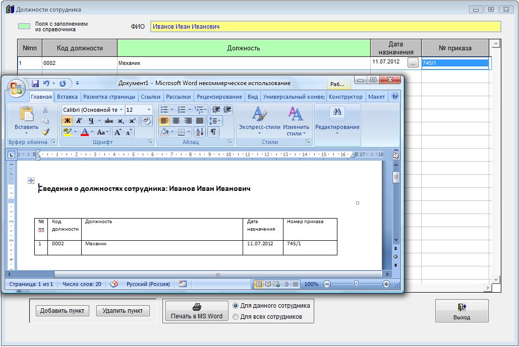 Если установлена опция "Для данного сотрудника", то в MS Word (OO Writer) , будет выведена информация только по данному сотруднику.