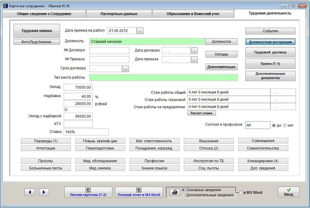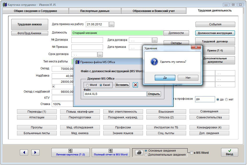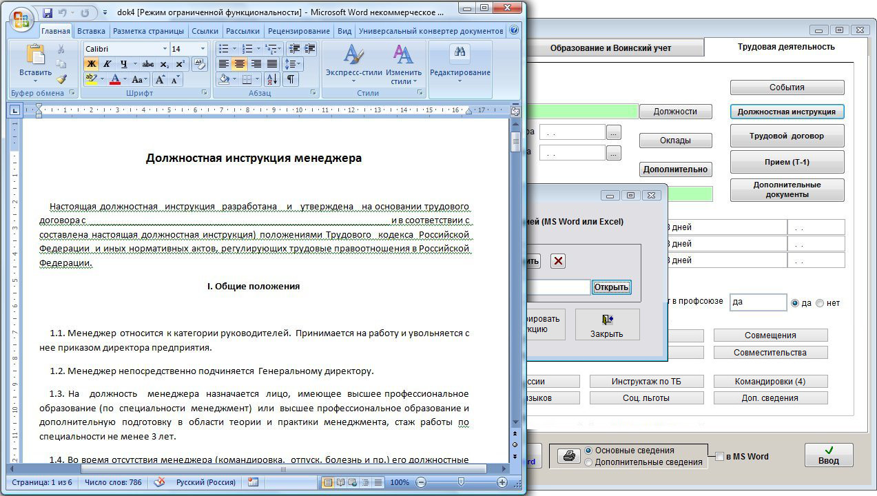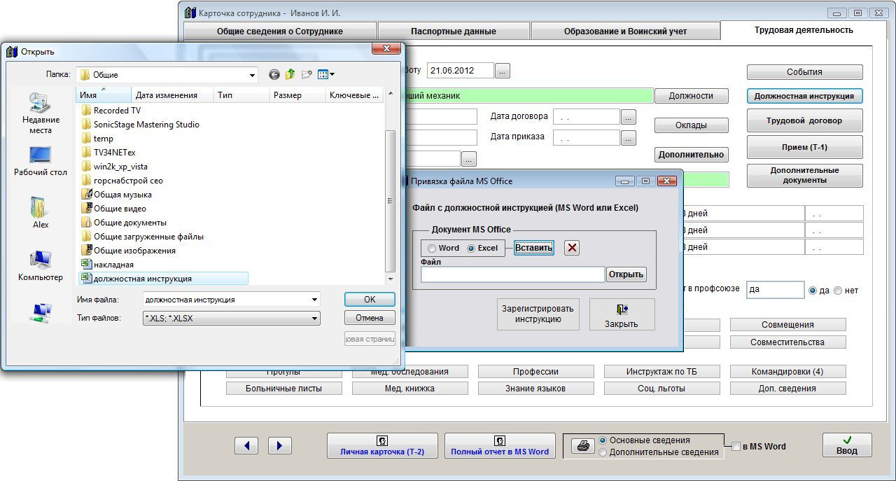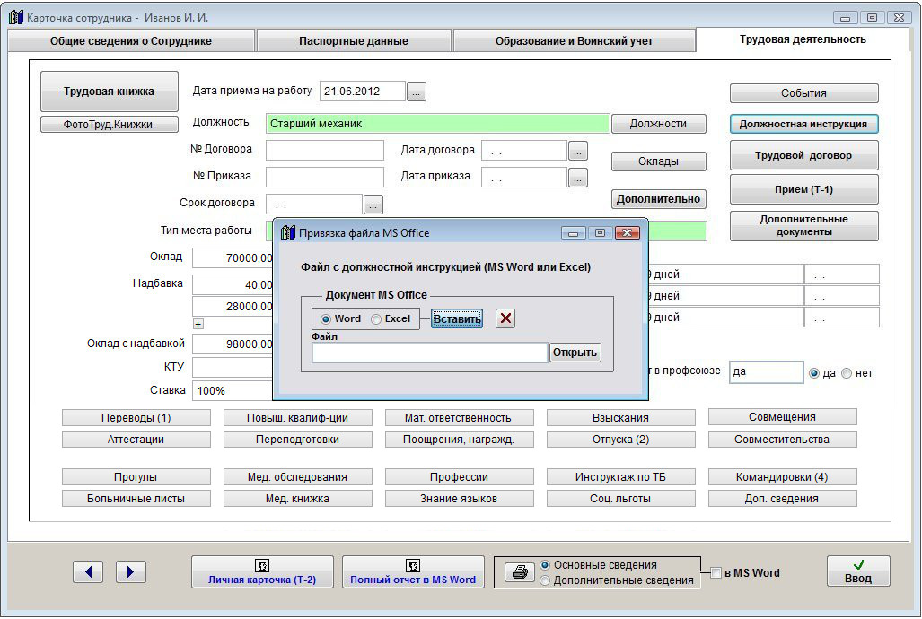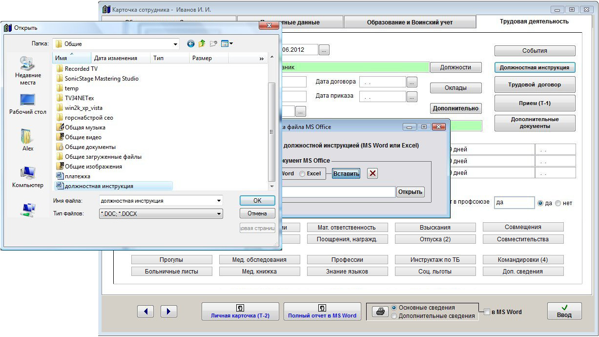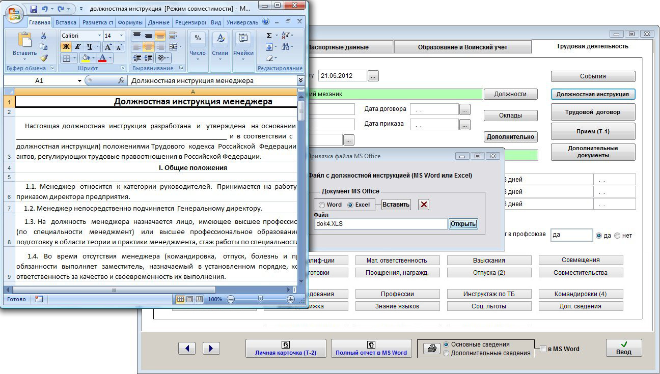Вы можете прикрепить к карточке сотрудника должностную инструкцию в формате MS Word (DOC, DOCX) либо MS Excel (XLS, XLSX).