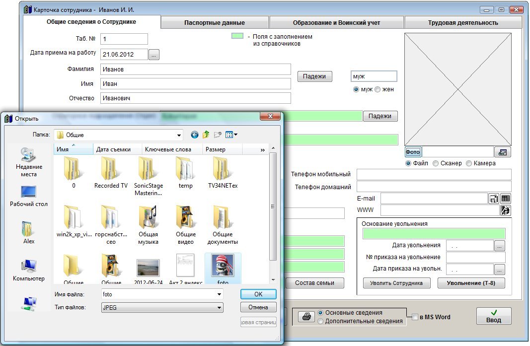 Также есть возможность загрузить отсканировать фото сотрудника сразу в программу.
