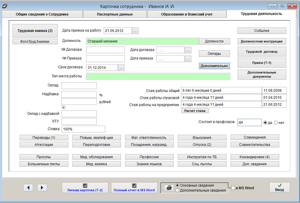 Для заполнения графика работы и привязки его к сотруднику откройте карточку сотрудника на редактирование (кнопка Изменить карточку в журнале сотрудников), перейдите в закладку Трудовая деятельность и нажмите кнопку "Дополнительно".