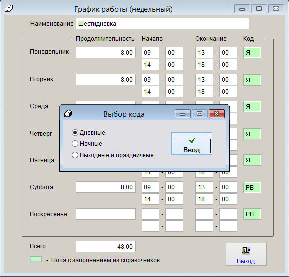 Выберите нужный код, который будет проставляться в табеле за выбранный день недели. Доступны опции Дневные, Ночные, Выходные и праздничные.