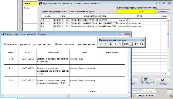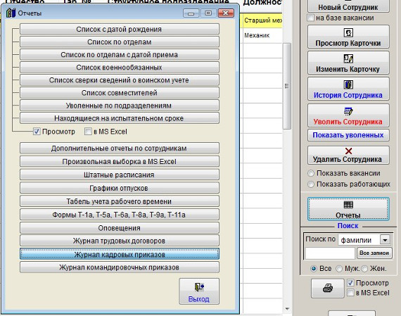 Для печати журнала кадровых приказов откройте журнал сотрудников и нажмите кнопку "Отчеты".