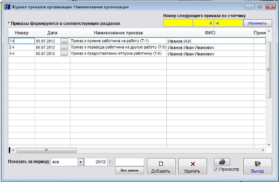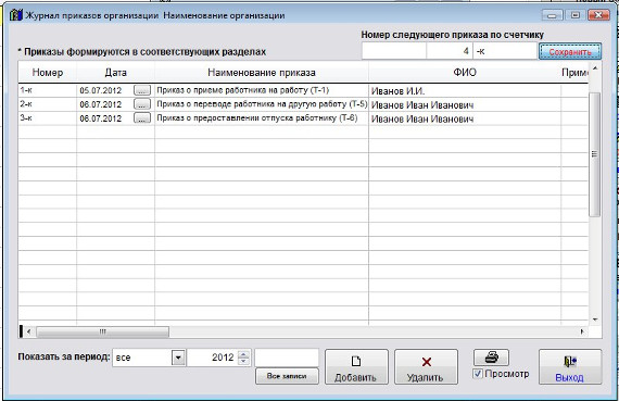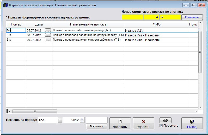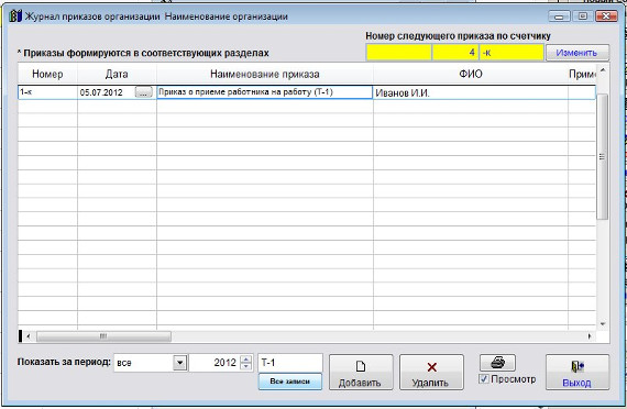 В случае, если включена автоматическая нумерация приказов, записи о приказах автоматически попадают в журнал кадровых приказов при формировании кадровых приказов в карточках сотрудников.