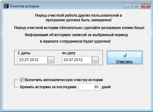 Установите интервал дат, за который следует очистить историю сотрудников (интервал предзаполняется автоматически с самой старой записи истории по текущую дату).