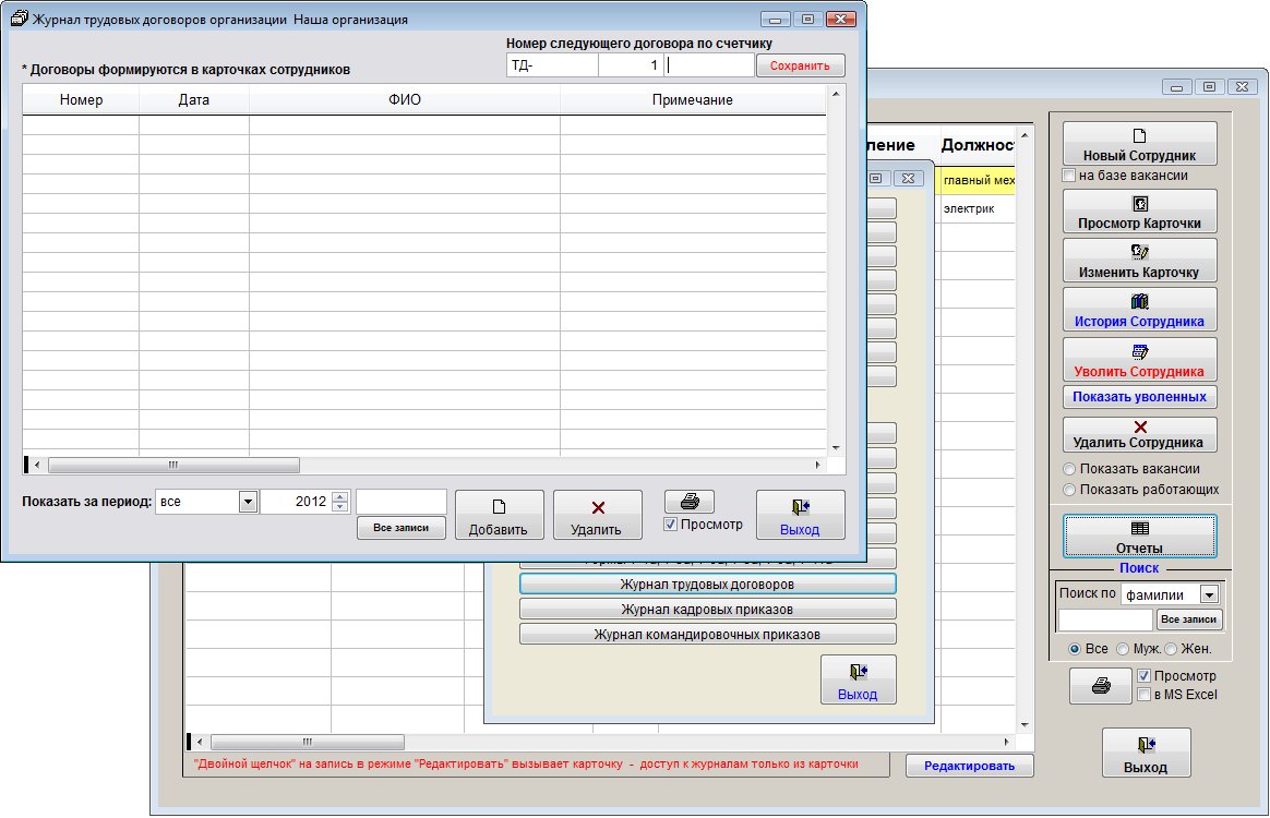 В результате трудовые договоры в журнале сотрудников начнут формироваться с номерами, начиная с номера, следующего за установленным значением счетчика и автоматически заноситься в журнал трудовых договоров.