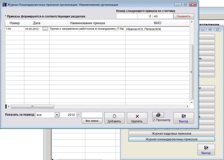 В результате кадровые (и командировочных) приказы в журнале сотрудников начнут формироваться с номерами, начиная с номера, следующего за установленным значением счетчика и автоматически заноситься в журнал кадровых (и командировочных) приказов.