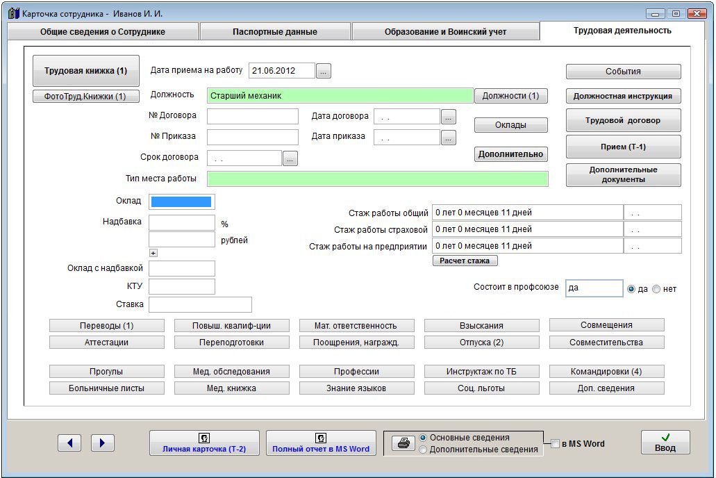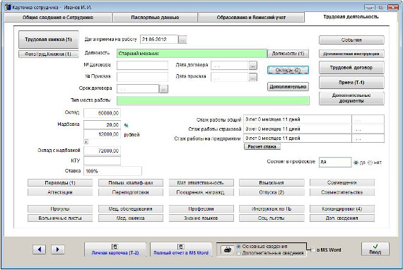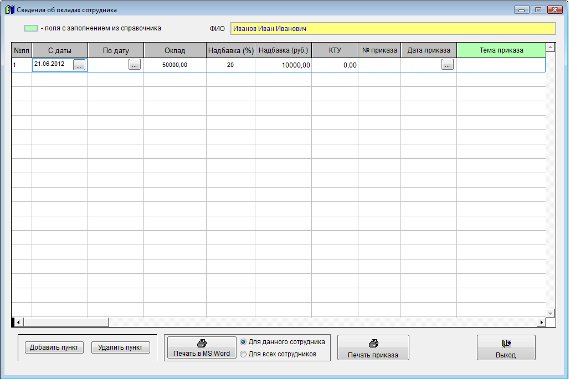 Если установлена опция "Для данного сотрудника", то в MS Word (OO Writer) , будет выведена информация только по данному сотруднику.