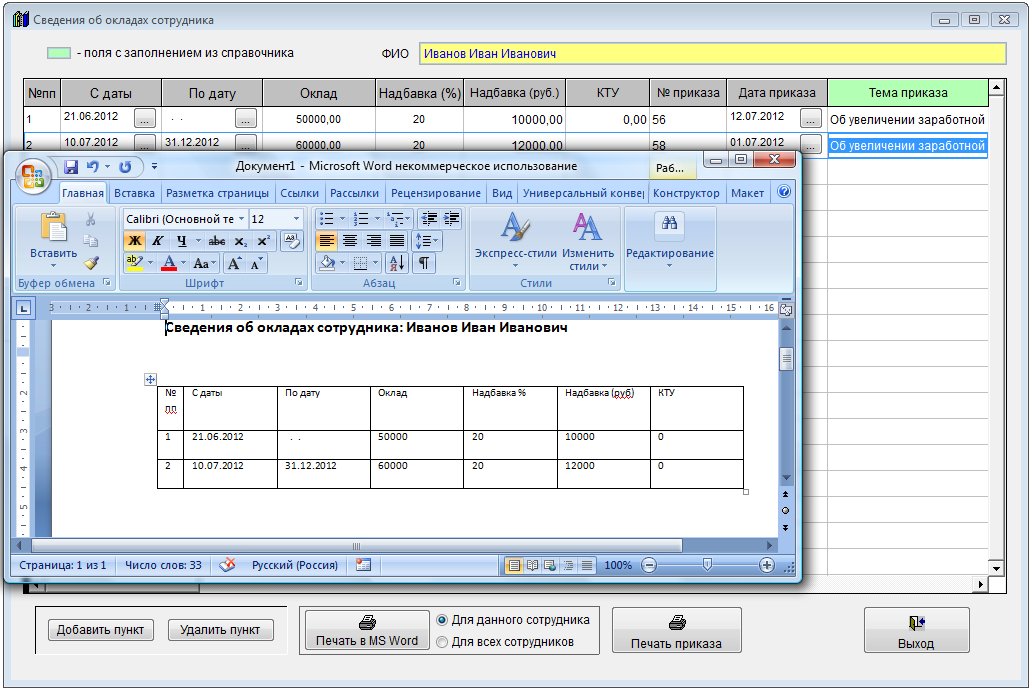 Таблица с записями об изменении оклада сформируется в установленном Microsoft Word либо при соответствующей настройке в OpenOffice Writer.
