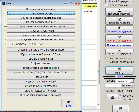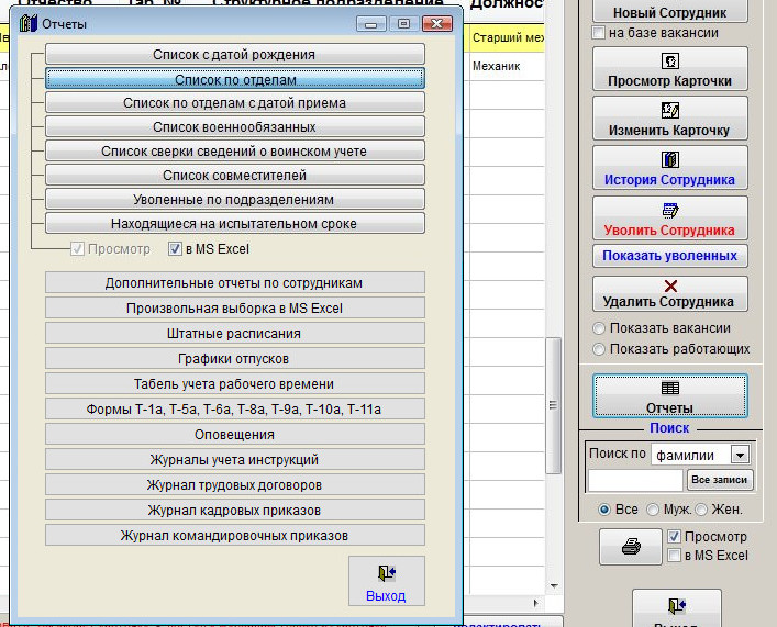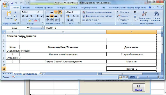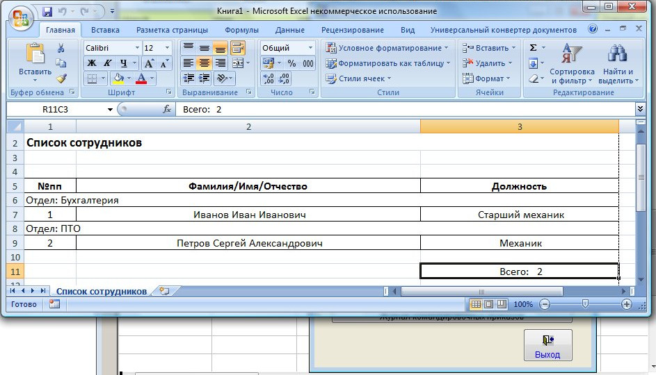 Список сотрудников по отделам сформируется в MS Excel (OO Calc).