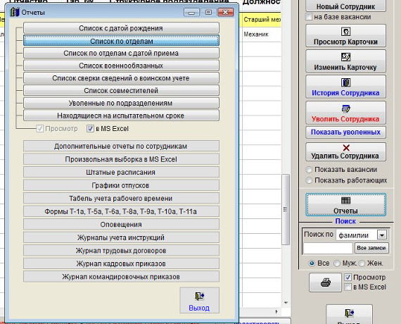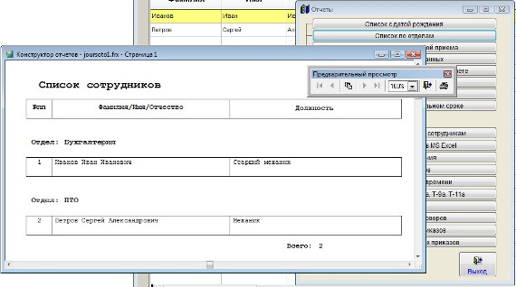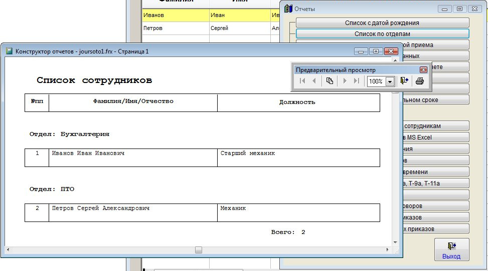 Для печати списка сотрудников по отделам откройте журнал сотрудников и нажмите кнопку "Отчеты".
