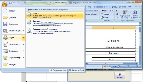 Для печати отчета из MS Excel (OO Calc) используйте пункт меню Файл-Печать либо кнопку с изображением принтера в левой верхней части окна MS Excel (OO Calc).
