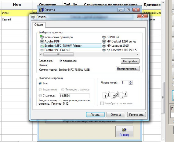 Выберите нужный принтер, установите количество копий и нажмите на кнопку "Печать".
