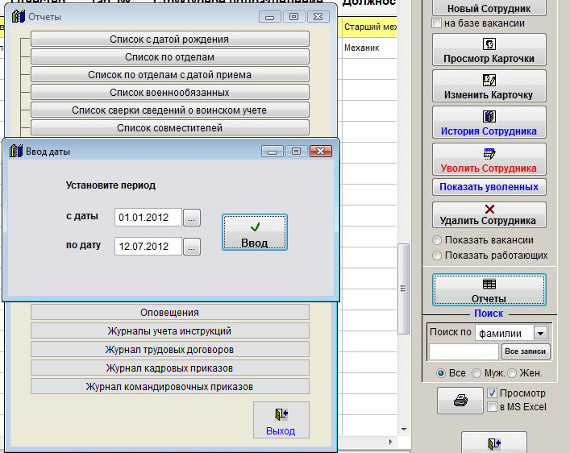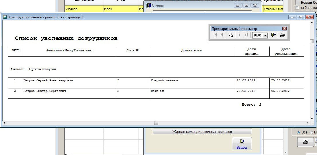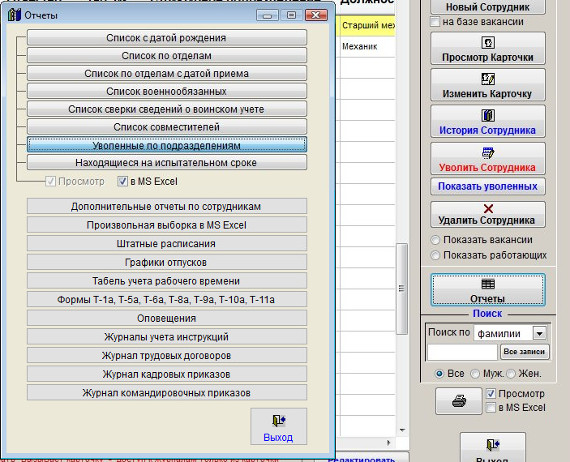 Для печати списка уволенных сотрудников по подразделениям откройте журнал сотрудников и нажмите кнопку "Отчеты".