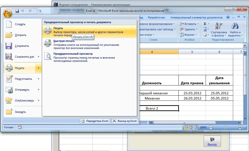 Журнал будет распечатан на принтере, который настроен в Windows по умолчанию.