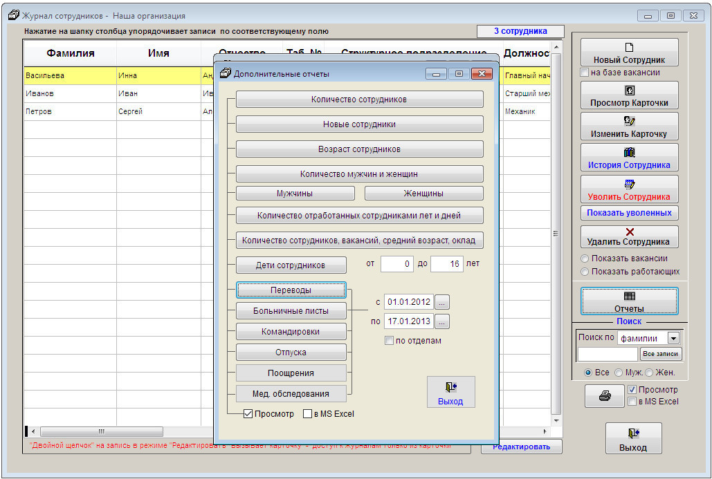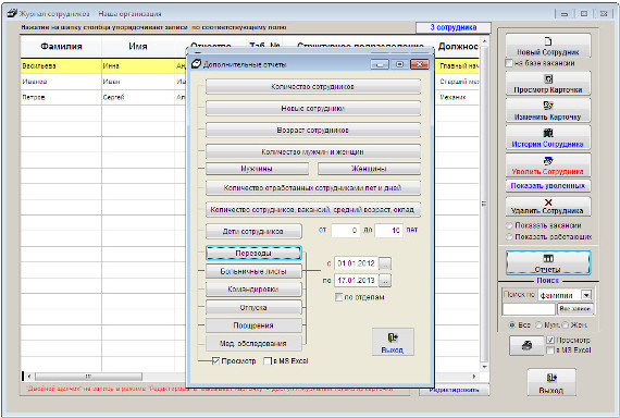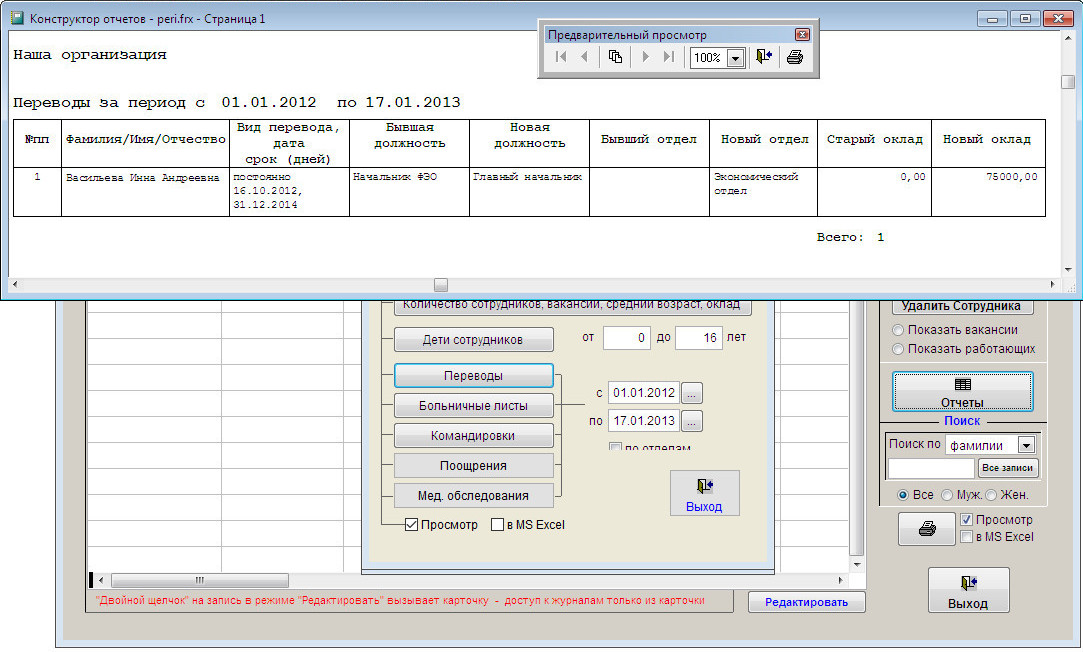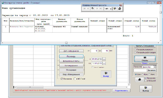 Для печати отчета "Переводы" откройте журнал сотрудников и нажмите кнопку "Отчеты".