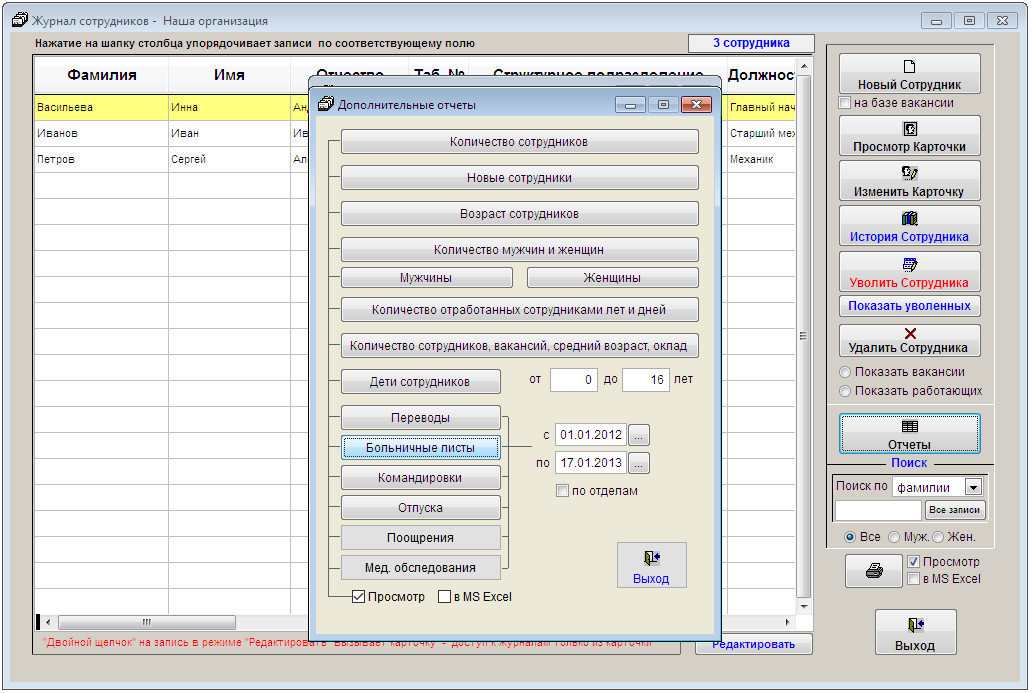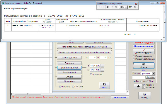 Для печати отчета "Больничные листы" откройте журнал сотрудников и нажмите кнопку "Отчеты".