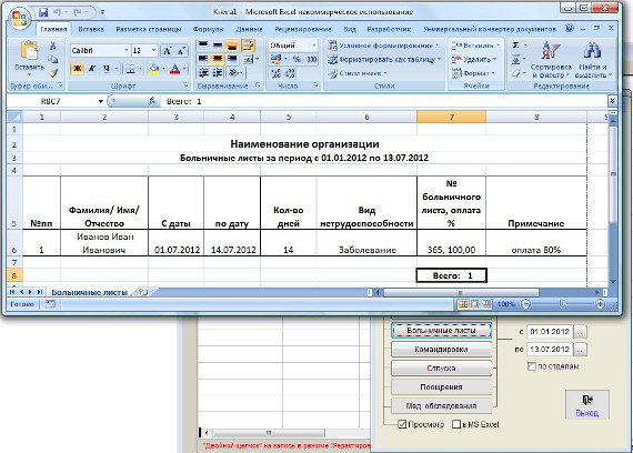 Для вывода отчета "Больничные листы" в установленный Microsoft Excel либо при соответствующей настройке в OpenOffice Calc установите галочку "В MS Excel" (OO Calc) и нажмите кнопку "Больничные листы".