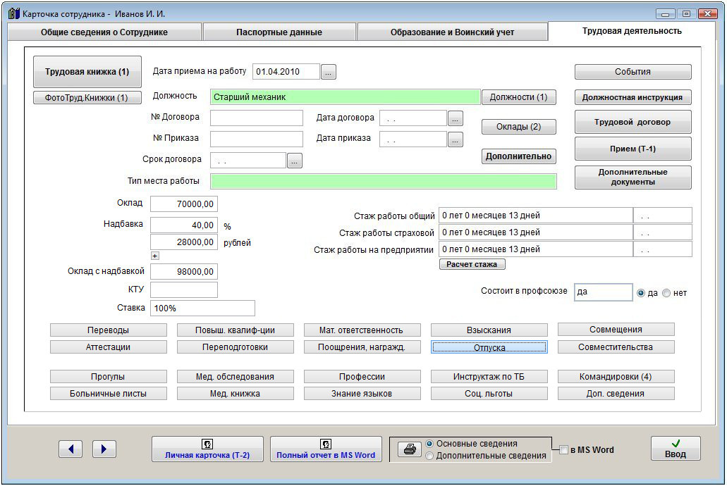 Если установлена опция "Для данного сотрудника", то в MS Word (OO Writer) , будет выведена информация только по данному сотруднику.