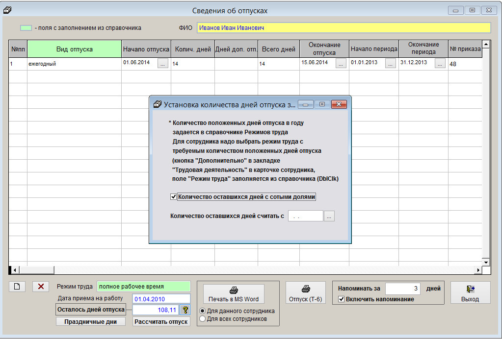 После выбора режима труда нажмите кнопку Ввод, для сотрудника будет выбран режим труда и количество оставшихся дней отпуска будет рассчитываться исходя из выбранного режима труда.