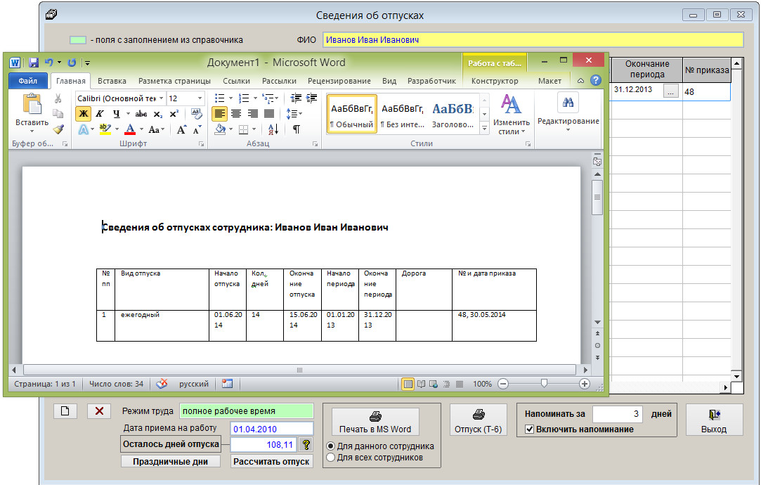 Таблица с записями об отпусках сформируется в установленном Microsoft Word либо при соответствующей настройке в OpenOffice Writer.