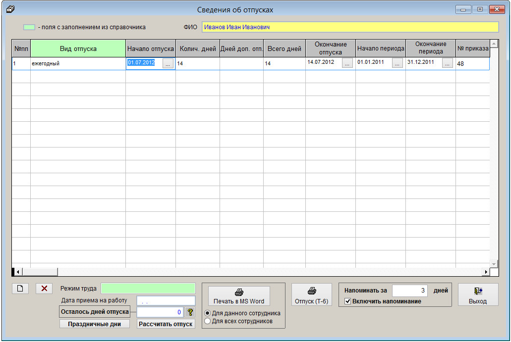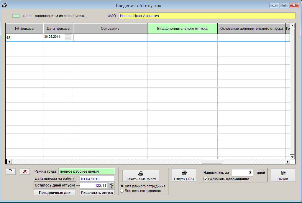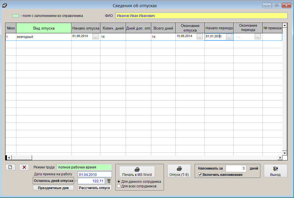 Затем в журнале отпусков установите дату начала отпуска и количество дней основного и, если нужно, дополнительного отпуска.