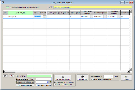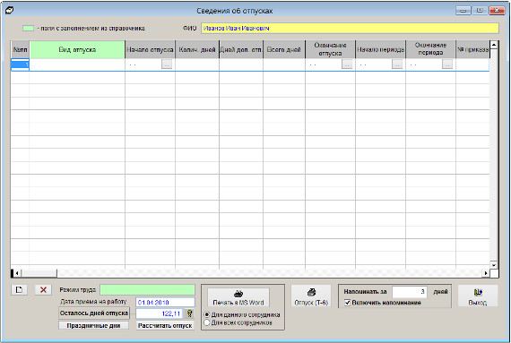 Для печати записей об отпусках используйте нажмите кнопку "Печать в MS Word".