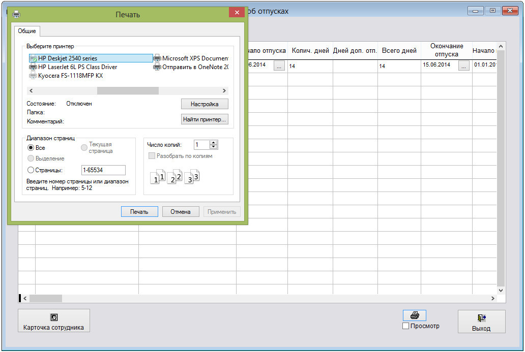 Выберите нужный принтер, установите количество копий и нажмите на кнопку "Печать".