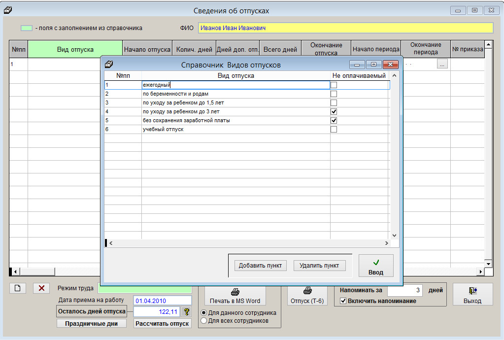 Выберите нужный вид отпуска, если требуется, добавьте в справочник новый вид отпуска, с помощью кнопки Добавить пункт добавьте пустую строку, внесите название вида отпуска и установите галочку "Не оплачиваемый", если данный вид отпуска является не оплачиваемым.