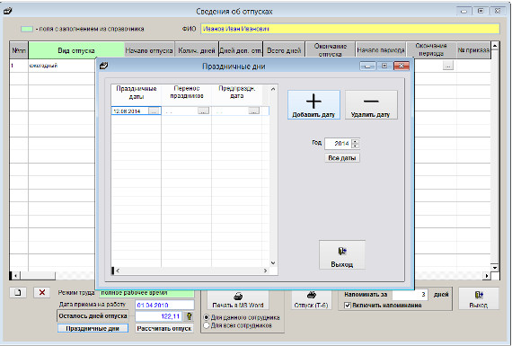 Также для правильного расчета периодов отпуска предварительно должны быть внесены праздничные дни.