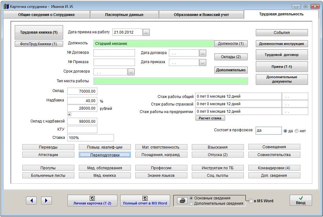 Для внесения записей о переподготовке сотрудника откройте карточку сотрудника на редактирование (кнопка Изменить карточку в журнале сотрудников) и нажмите кнопку "Переподготовки" в закладке "Трудовая деятельность".