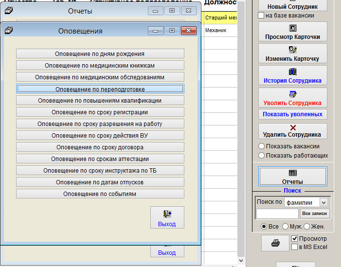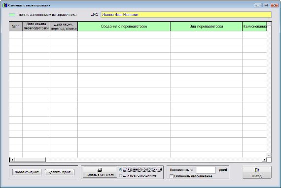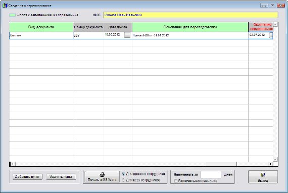 В программе есть функция оповещения по дате окончания свидетельства о переподготовке.