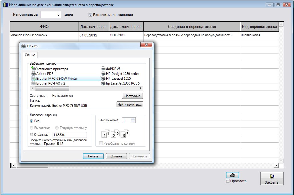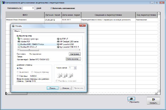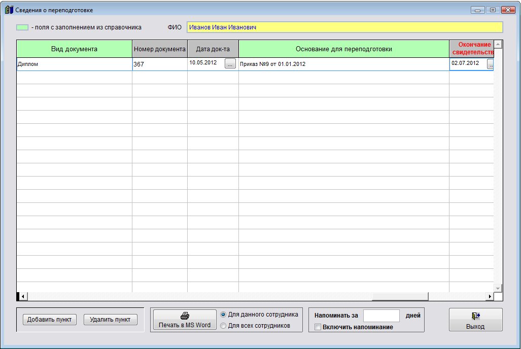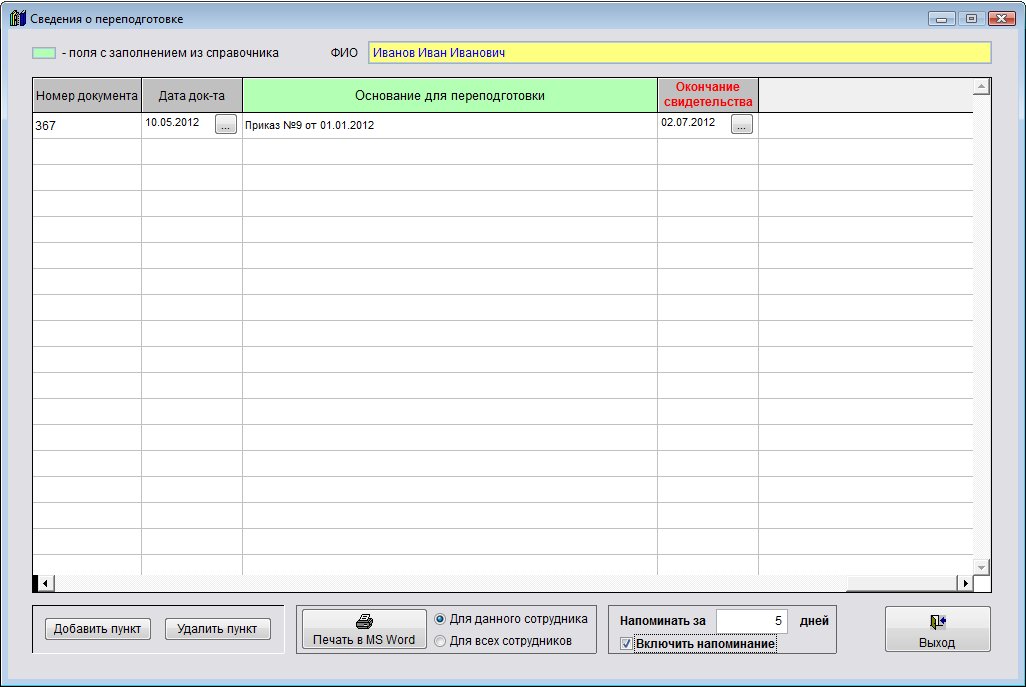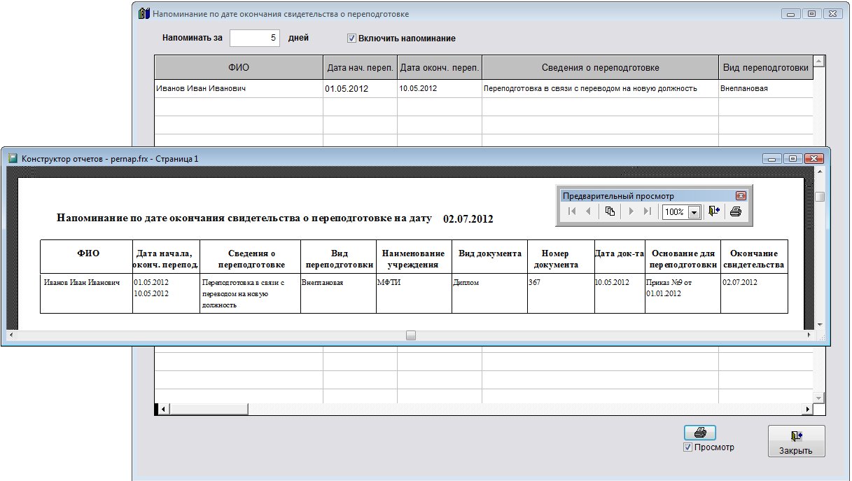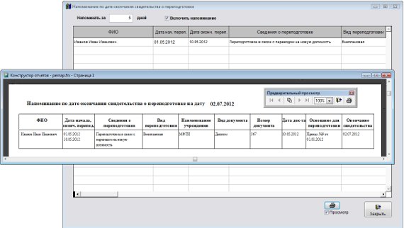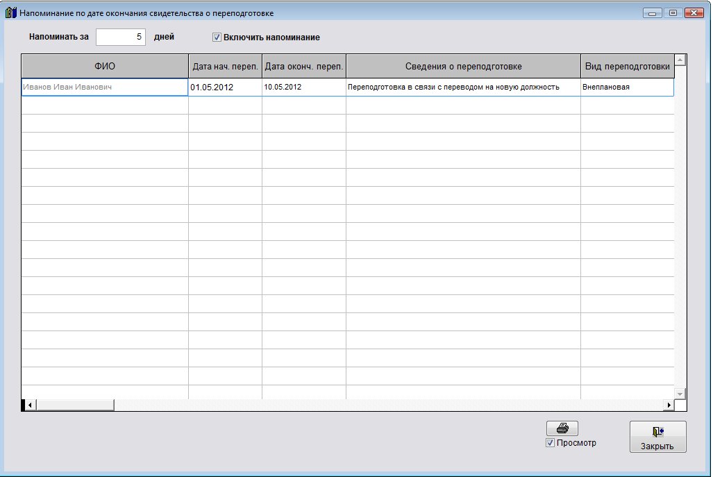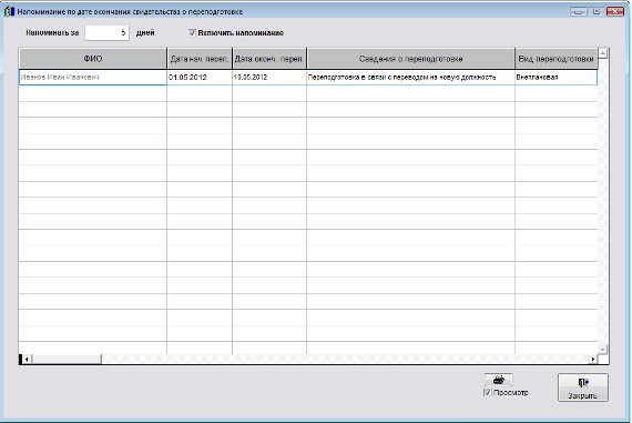 Откроется окно "Напоминание по дате окончания свидетельства о переподготовке".
