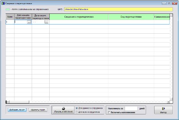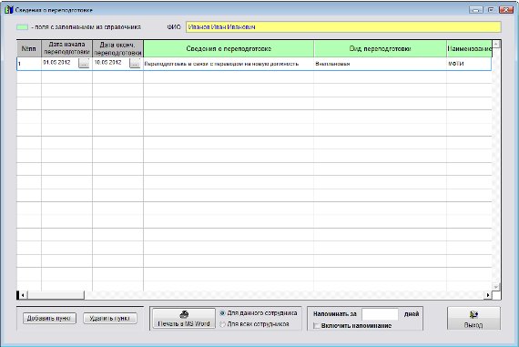 Для печати записей о переподготовке используйте нажмите кнопку "Печать в MS Word".