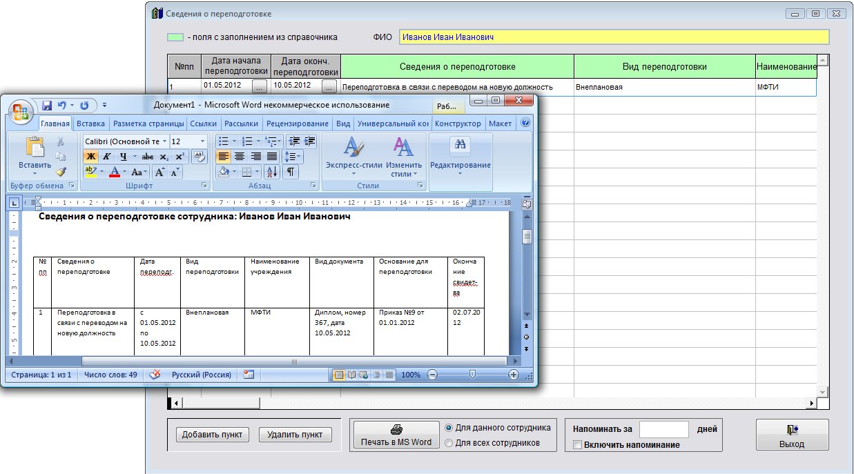 Таблица с записями о переподготовке сформируется в установленном Microsoft Word либо при соответствующей настройке в OpenOffice Writer.