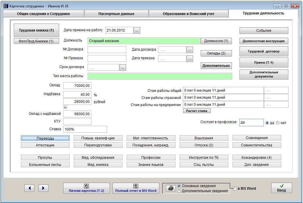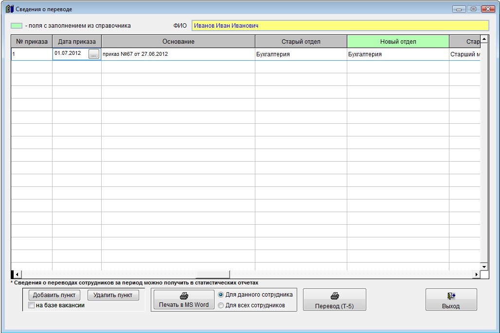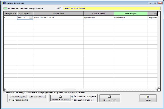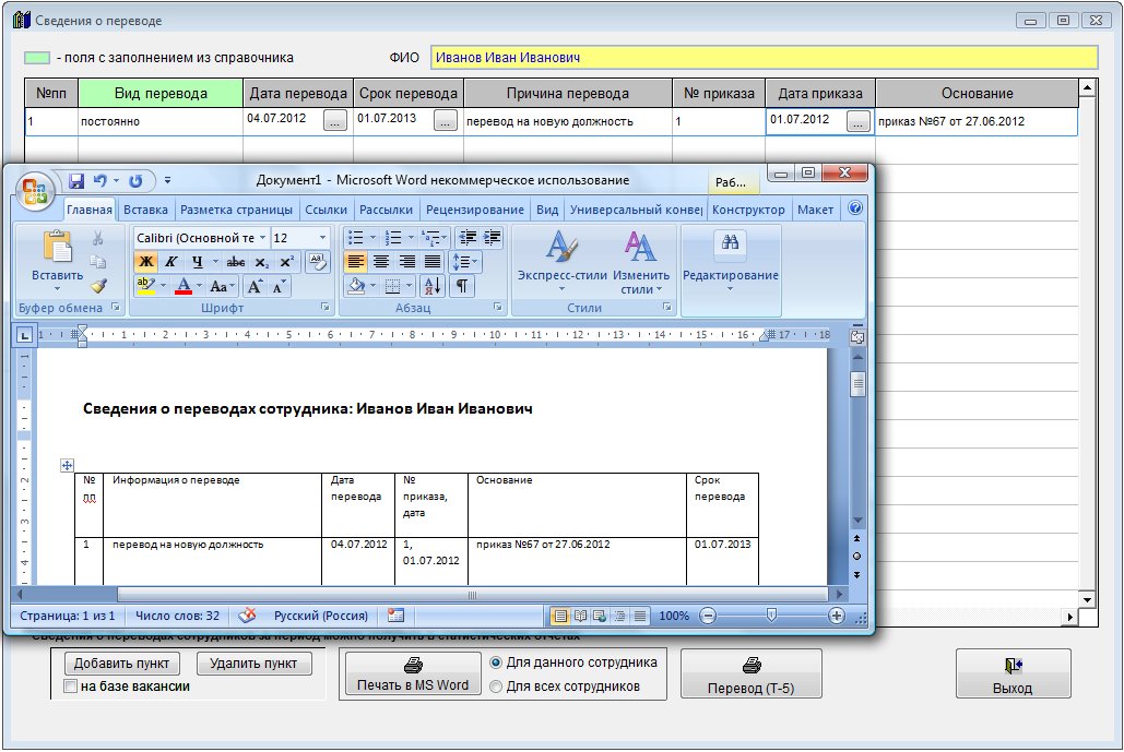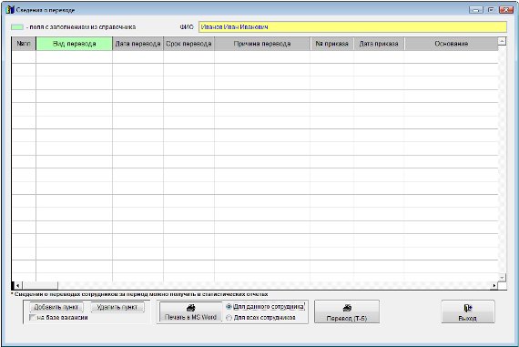 Если установлена опция "Для данного сотрудника", то в MS Word (OO Writer) , будет выведена информация только по данному сотруднику.
