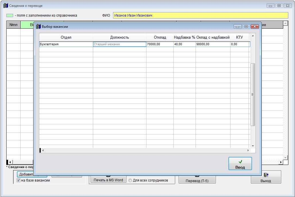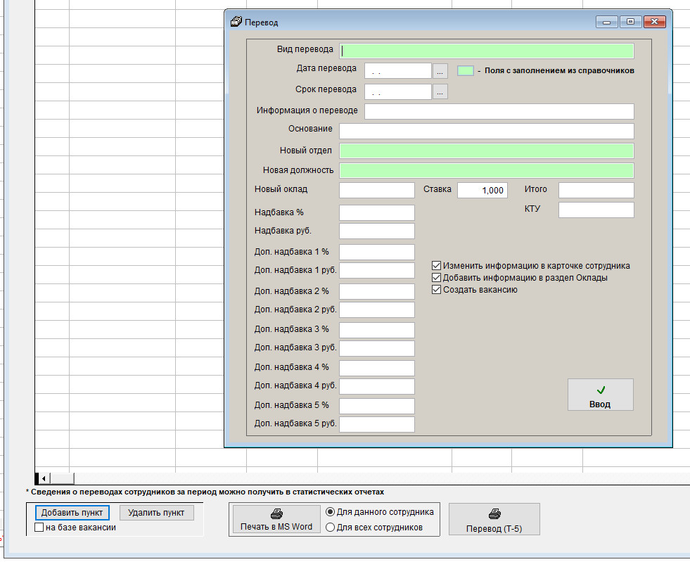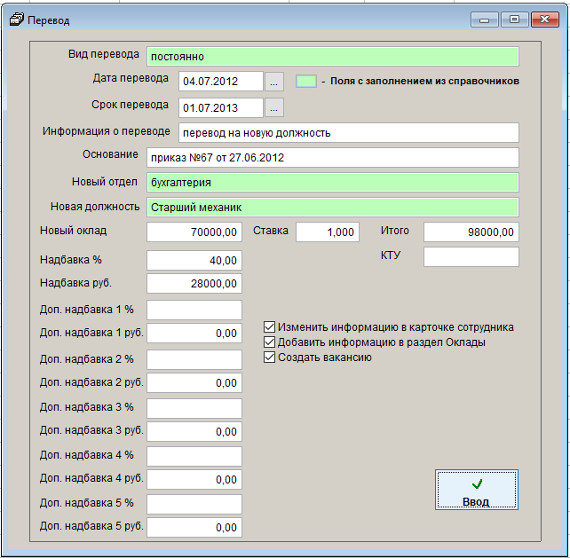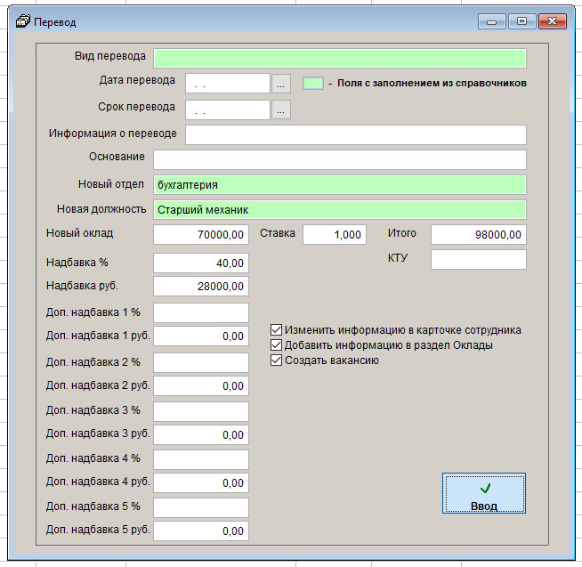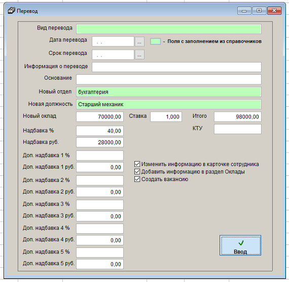 Откроется окно ввода нового перевода, часть полей будет заполнена информацией из вакансии.