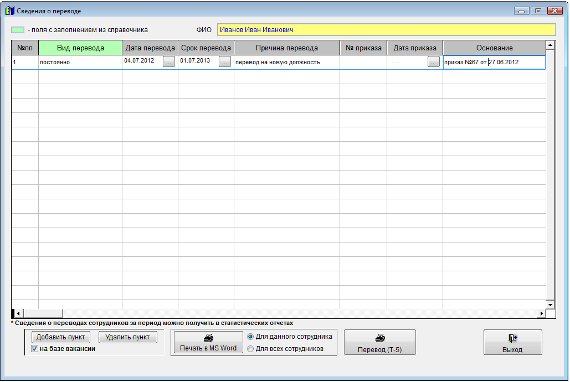 Для печати записей о переводах используйте нажмите кнопку "Печать в MS Word".