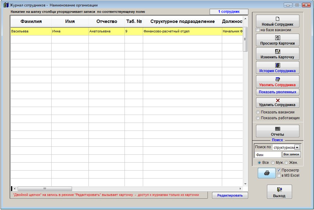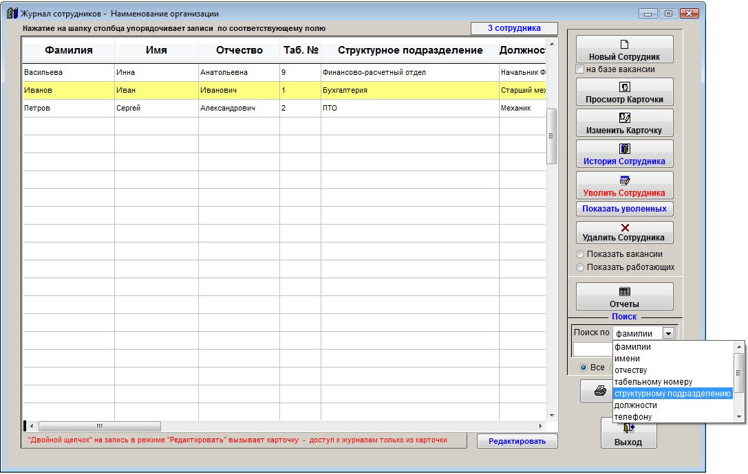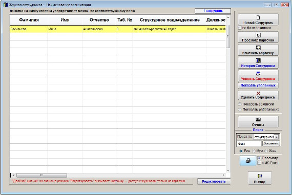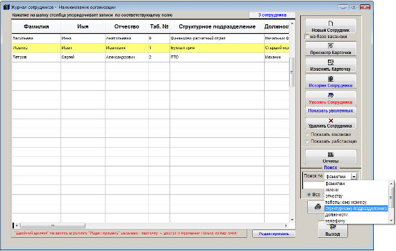 Для быстрого поиска сотрудников по отделу используйте фильтр "Поиск по-Структурному подразделению" в журнале сотрудников.