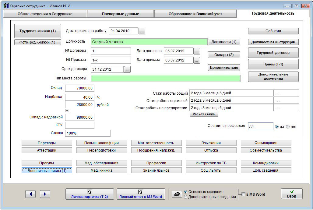 Для печати приказа по больничному листу сотрудника откройте карточку сотрудника на редактирование (кнопка Изменить карточку в журнале сотрудников) и нажмите кнопку "Больничные листы" в закладке "Трудовая деятельность".